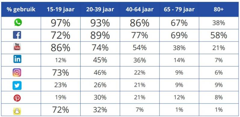 In Nederland gebruiken zowel jonge als oudere mensen social media. Onderstaande afbeelding geeft de meest gebruikte social media kanalen weer.